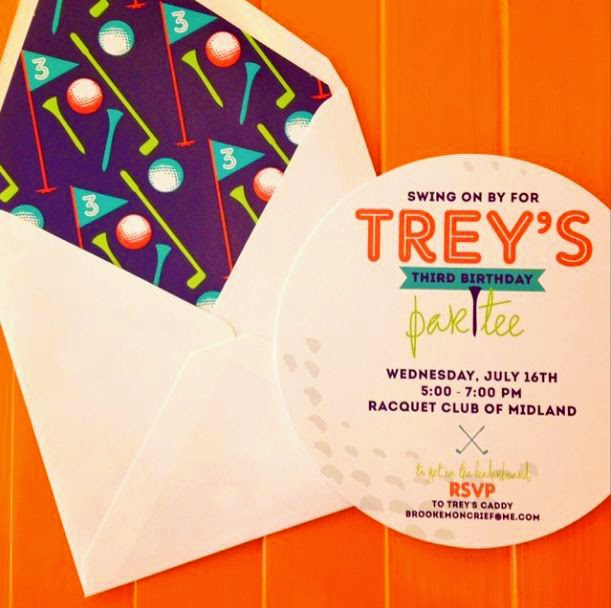 If there’s one thing we’ve done well this summer…it’s par-tee! Golf themed birthday parties that is. We started our summer off with a preppy pink and green golf birthday party that was beyond adorable! Fast forward a few months, and one of our favorite clients (who always goes above and beyond for her kids’ parties) came to us wanting us to create something special for her son’s birthday. We’ve done Trey’s parties for the past three years, and each year his birthday’s get more and more fabulous! So we knew that starting with his invitation, we had to get creative! Check out the finished product below…it will make you want to par-tee!!