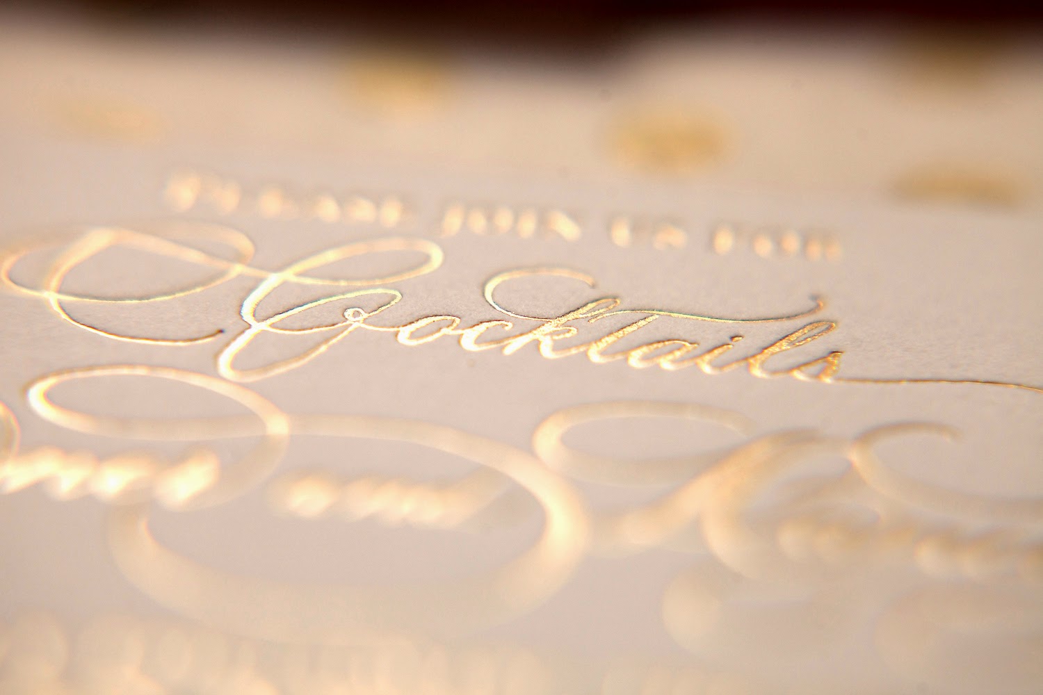 Claire and Chris’ wedding invitation utilized both calligraphy and a simple block font to make the couple’s names stand out! Printed in gold-foil, their elegant invitation also featured beveled edges which were painted gold.