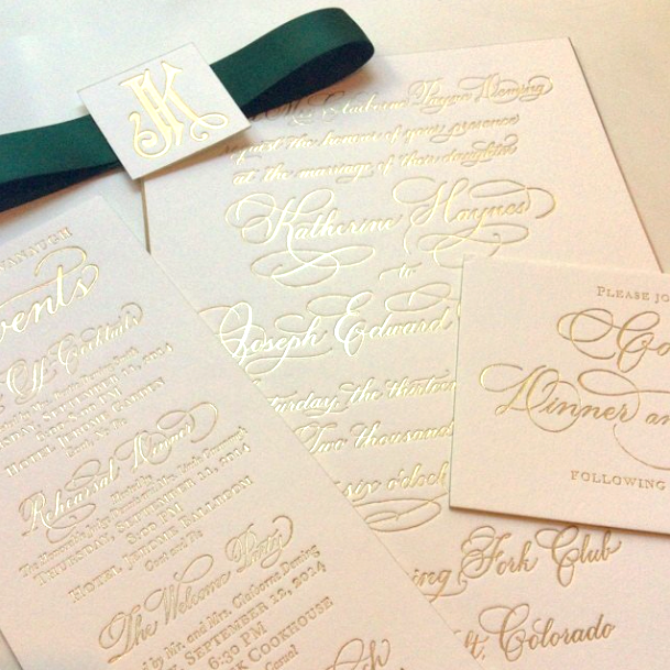 Kate and Joe’s custom wedding invitation was done in full calligraphy, and also printed in gold-foil. Their wedding ensemble was wrapped with a hunter green ribbon, paying homage to the wedding’s location in Aspen, Colorado.