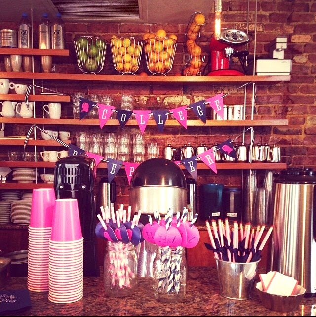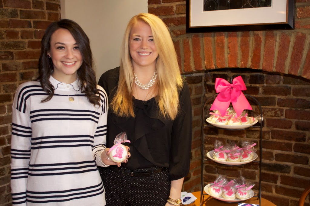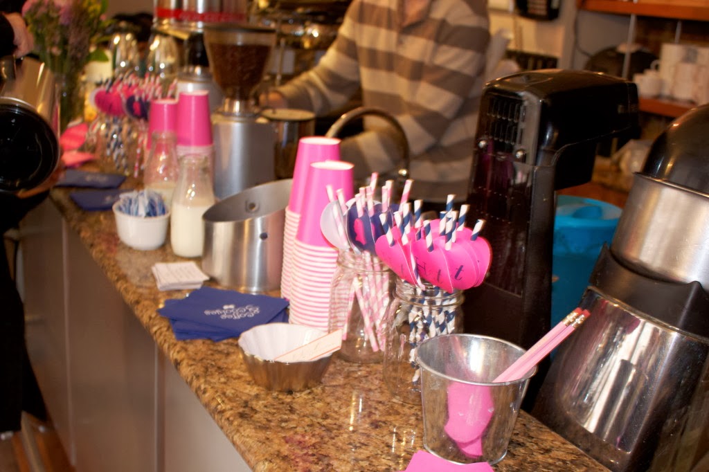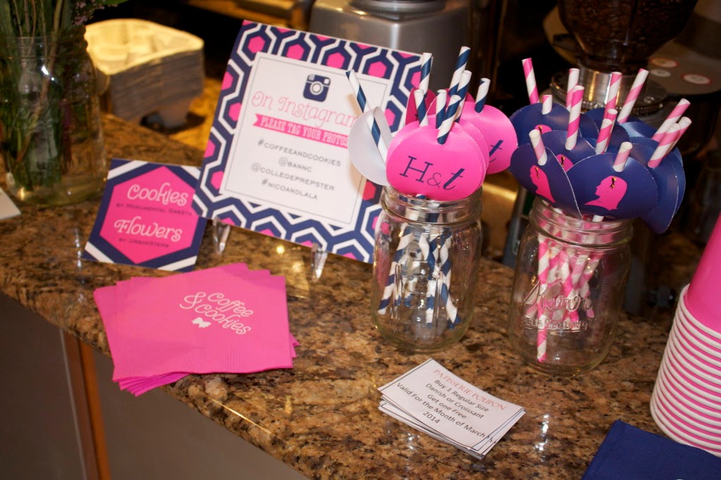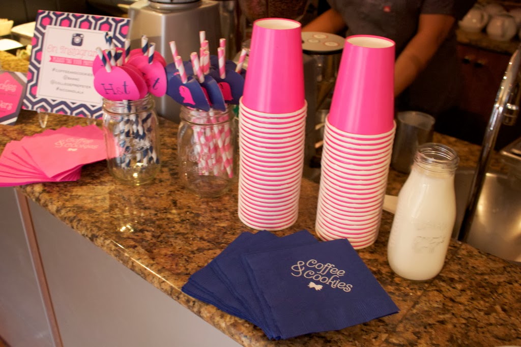 After the RSVP’s started rolling in, the real fun began…party swag! With over 200+ people expected to attend, BAC hosted the coffee and cookie’s event at a local Georgetown coffee bar. To turn the coffeeshop into a real College Prepster party, we designed lots of pink and navy party swag including napkins, banners, and of course…straws featuring both Carly and Brittney Ann’s blog logos. Combined with the adorable cookies BAC had made, and all of Carly’s adorable and stylish readers…it ended up being one swanky party!!