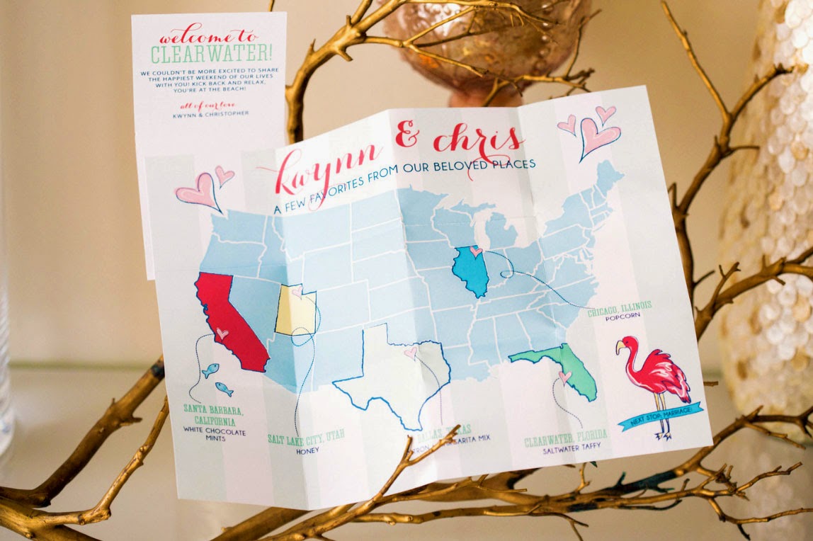Besides being one of the nicest couple’s we’ve ever worked with, Kwynn and Chris also happened to be one of the most creative…which we let shine through in their welcome box design. Both K&C appreciate all things preppy, and wanted the beachy feeling of their wedding destination (Clearwater, FL) to shine through. So we helped them create a custom Lily-inspired wedding pattern, which was the main design element of their welcome boxes!! Their pattern included bright colors, tropical elements (such as flamingos, seahorses, and coral), as well as their monogram and wedding date. All together it looked fabulous!! Check out pictures of the goodies inside their welcome box, below!