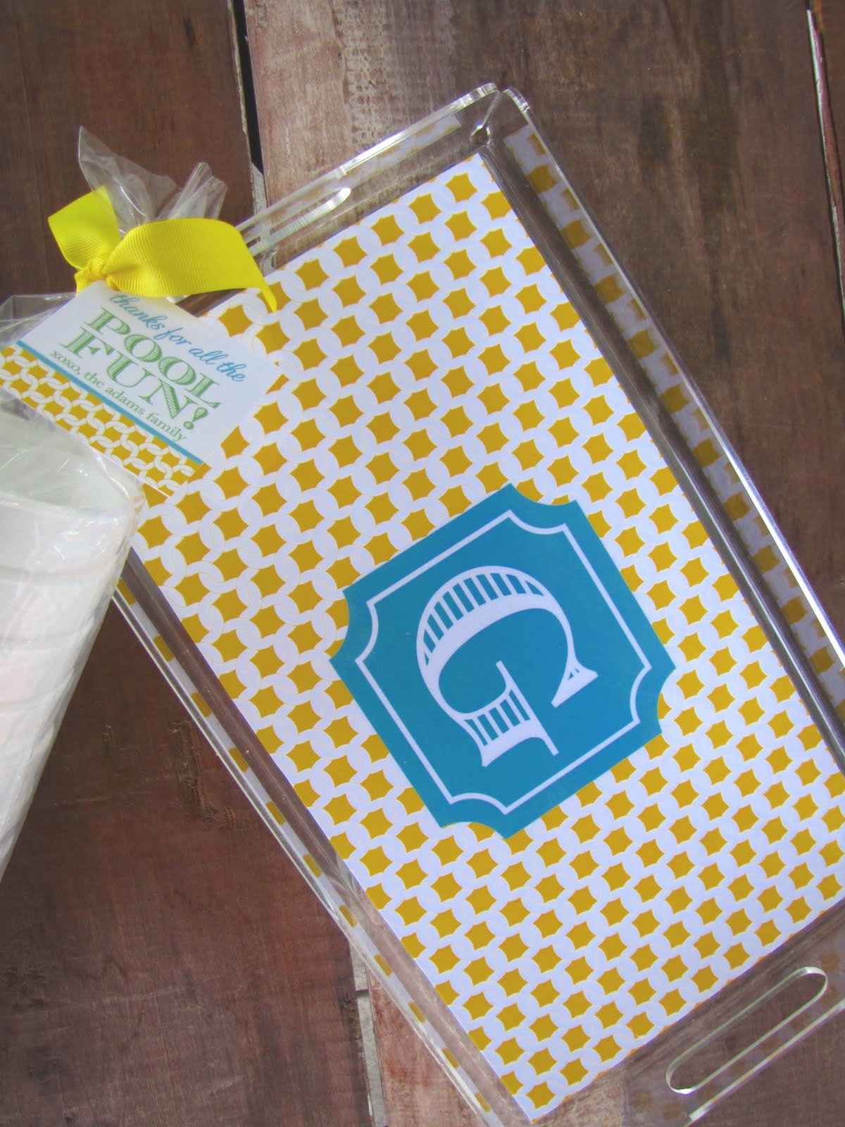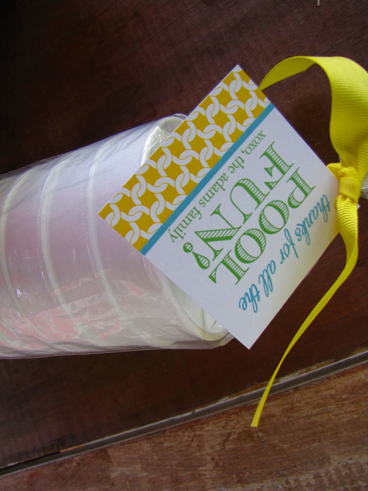 Enter in custom lucite tray, matching styrofoam cups, and cute tag to tie it all together, and voila! Perfect Pool Party Thank you!
