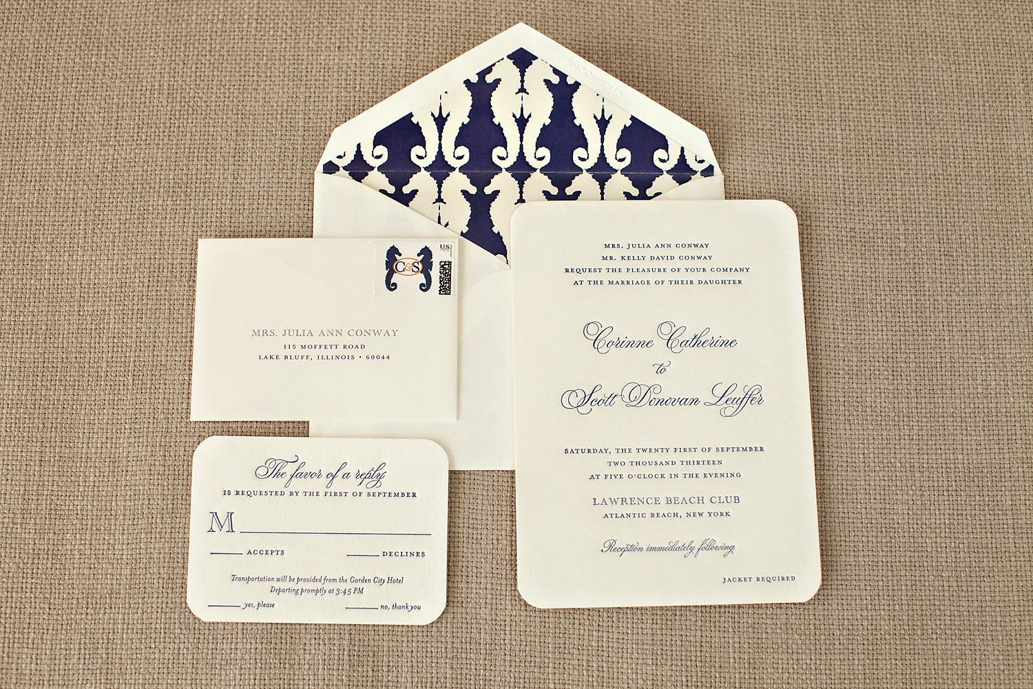 Corinne and Scott’s elegant letterpress wedding invitation. While the pair kept their invitations pretty traditional, we love the fun addition of their seahorse patterned envelope liner. We absolutely died when we put the ensemble together!