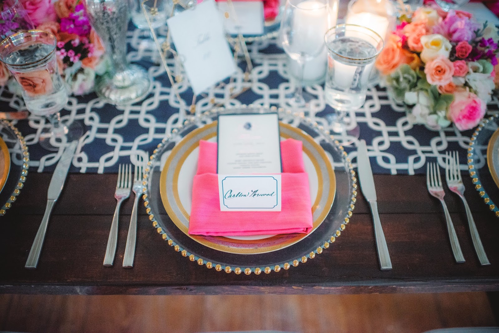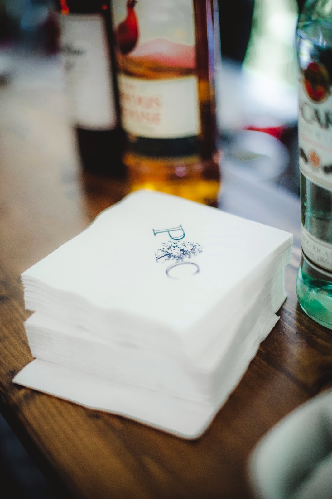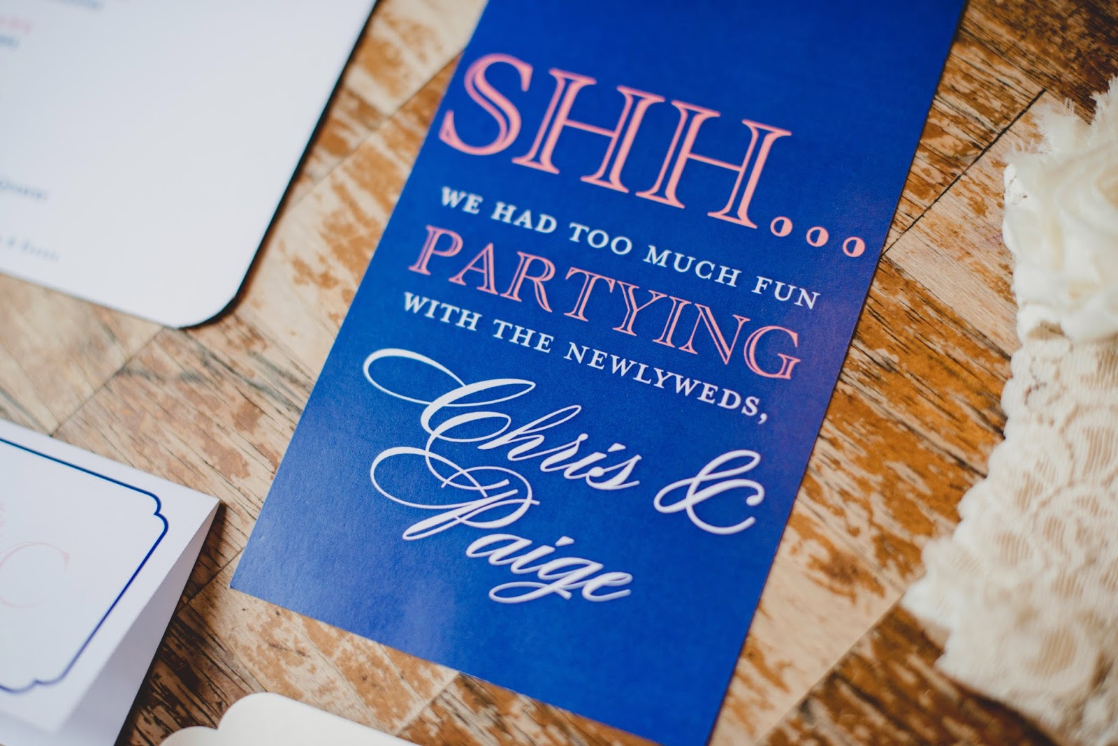 Paige and Chris’ wedding invitations were printed in traditional navy letterpress on a thick, white paper with scalloped edges. The beautiful ensemble was held together with a coral bellyband, and was finished with their wedding monogram. We love that they were classic, with a fun twist that highlighted their beautiful monogram.