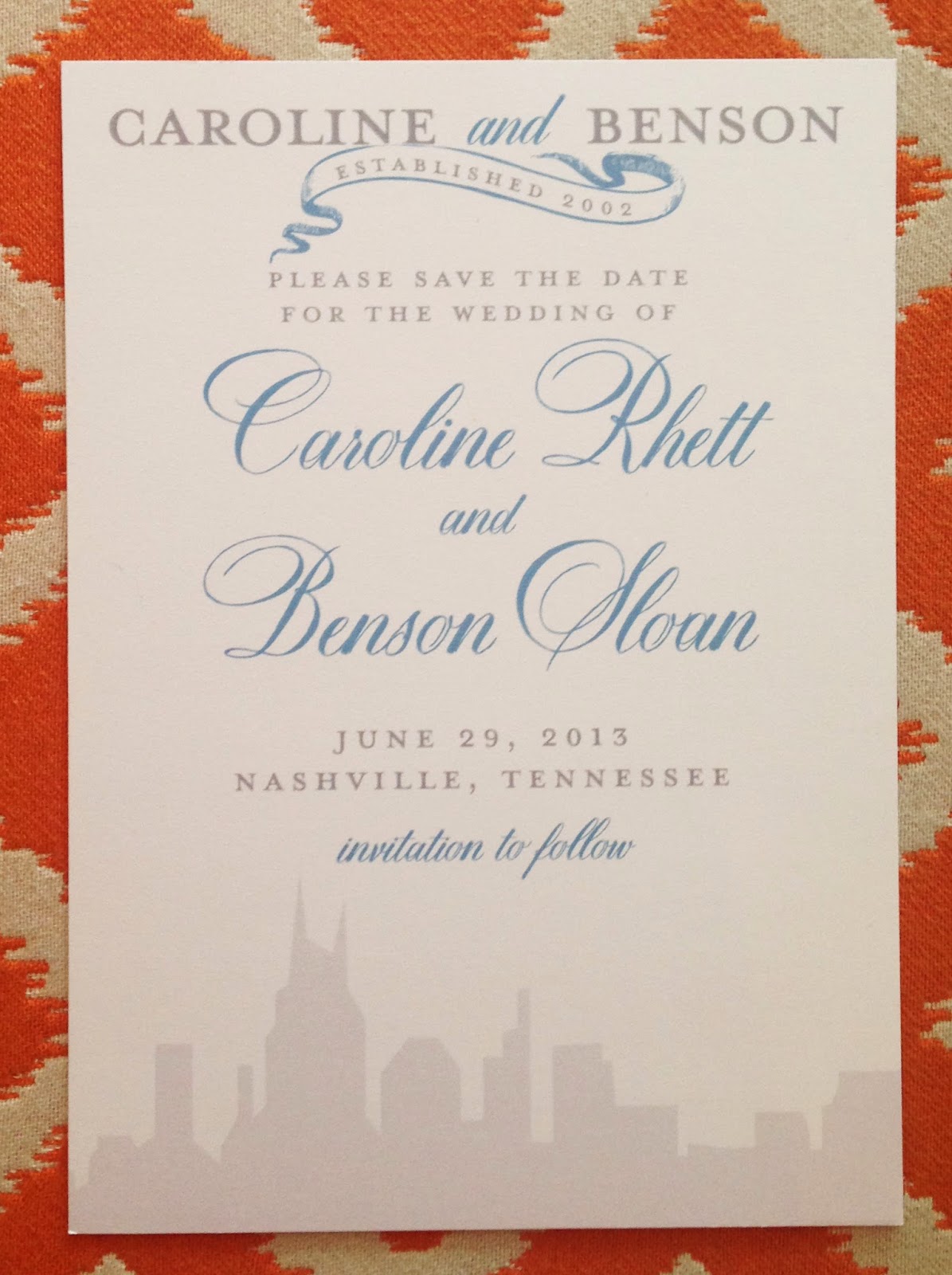 Although we currently reside in Chicago, part of our hearts are still in Nashville. So we absolutely love a good ‘ole Nashville southern wedding!! Caroline and Benson wed last summer in the Music City, and their sweet day was not one to be missed. We truly believe that small details are what make an event special, so we helped create pretty finishing touches for their big day! Before we got started on their wedding, we created their Nashville inspired save the dates. Check it out!