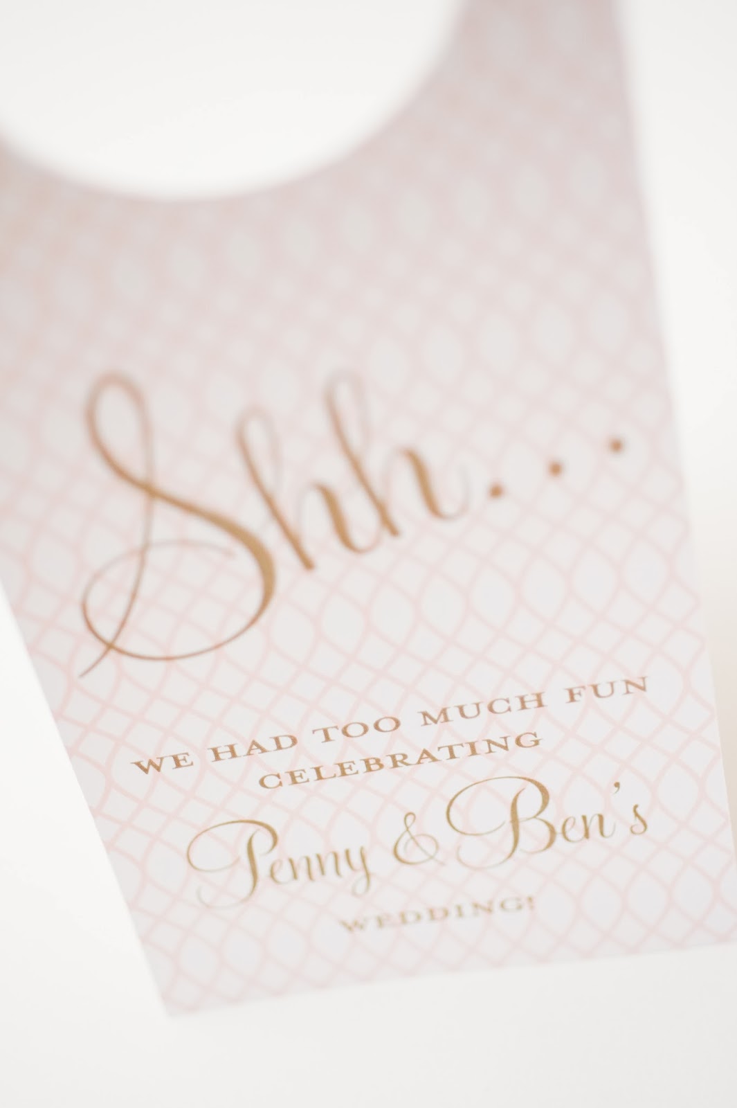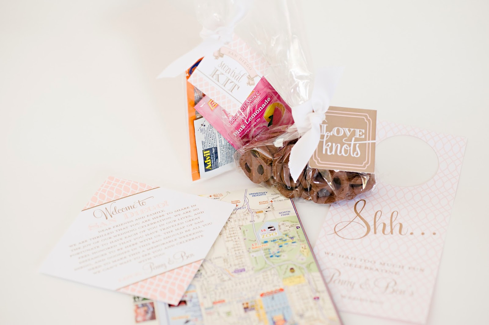 Penny and Ben’s wedding welcome bag was filled with all sorts of goodies including a custom door hanger, love knots, a survival kit, water bottles, a map, and a sweet thank you note from the couple.