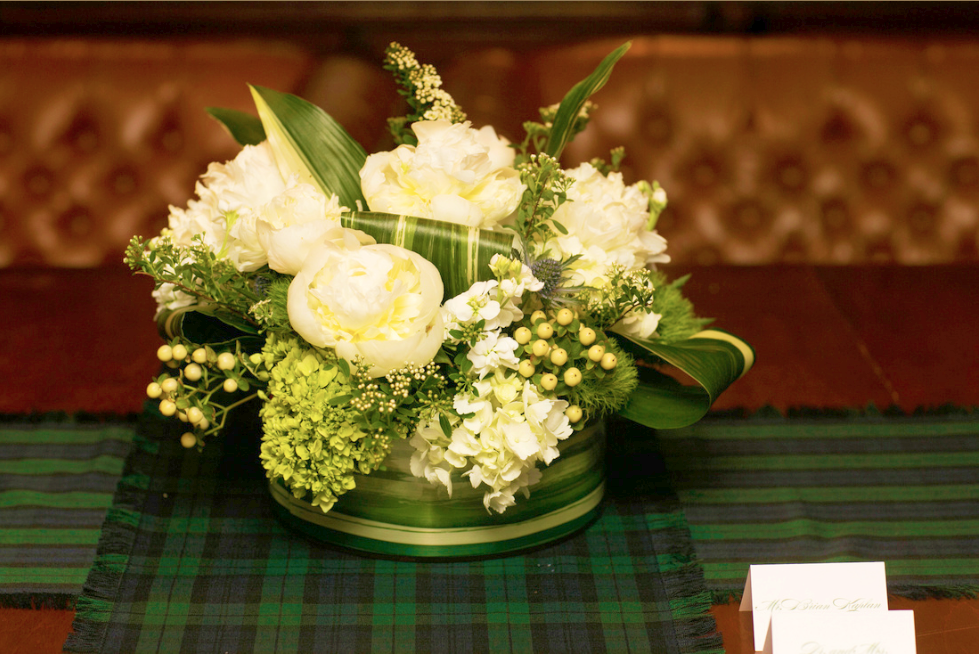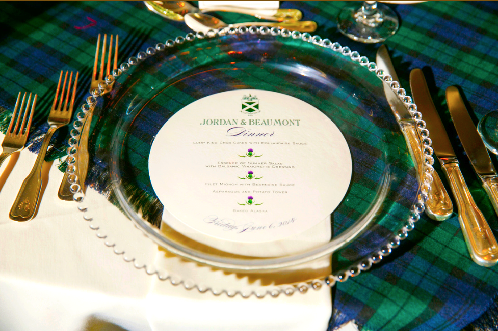 The couple’s dinner menus (which featured both the family crest and thistles) nestled perfectly inside the chargers and accented the tartan tablecloths exquisitely!