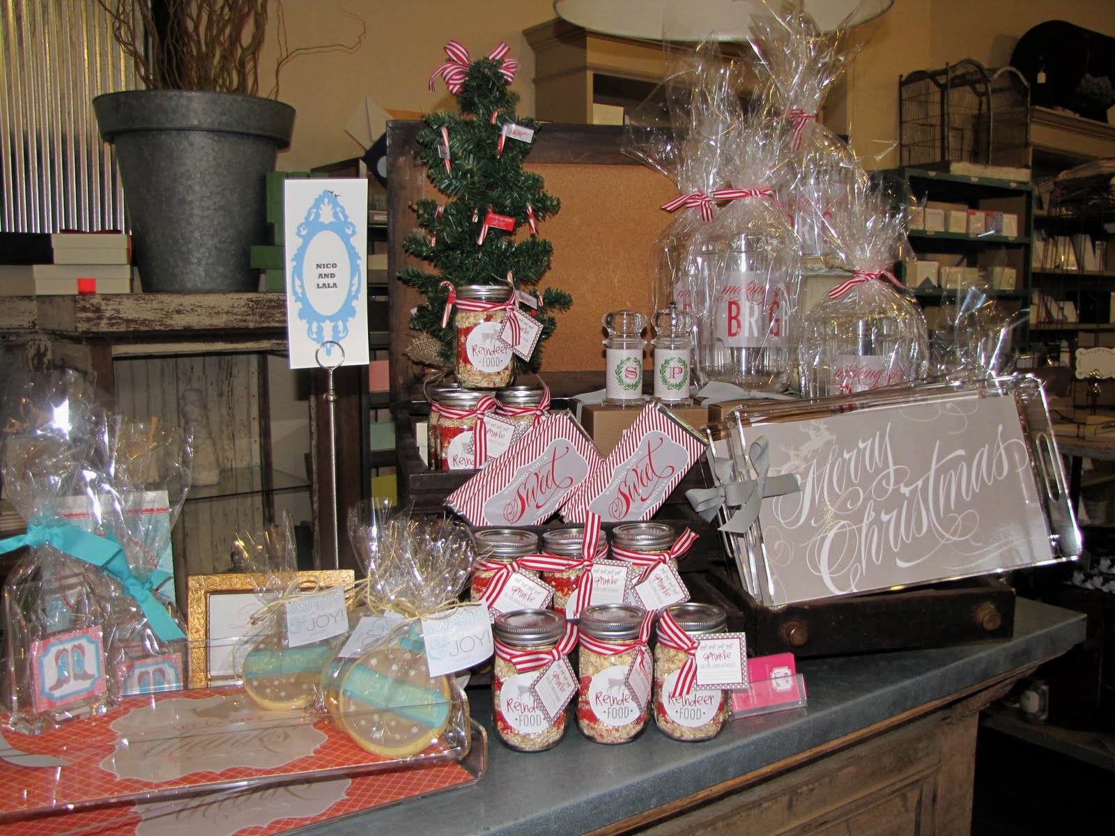 Close up of our area! Top right, wine chillers…$40 each and read “Making Spirits Bright”–you can’t really tell from the pic because of the cello, but they are so pretty! Bottle of wine + wine chiller = great gift and sure to make anyone’s spirits bright!
