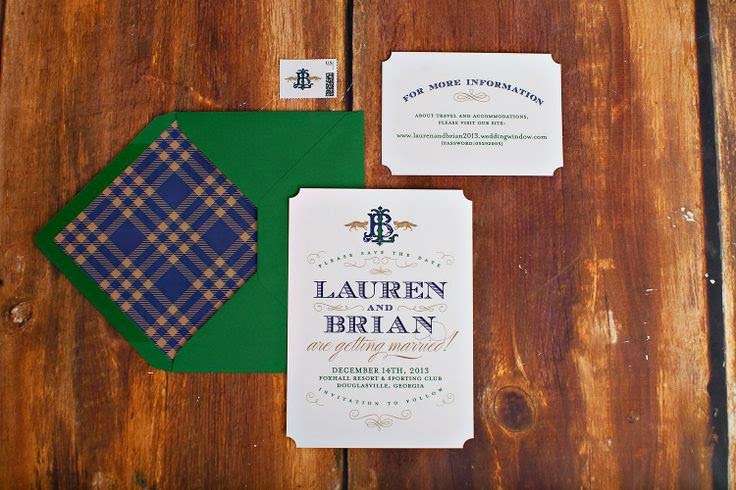 2. Ralph Lauren Wedding: Last year, we created an amazing wedding invitation for Lauren and Brian, who tied the knot at the Foxhall Hunting and Sport Club just outside Atlanta. For Lauren’s wedding paper design inspiration, she wanted to incorporate the feel of their unique venue into their invitations, while also celebrating the holiday season. The first thing that came to our minds was an invitation inspired by the wonderful world of Ralph Lauren. Think classic tartan plaid, a rich color palette, all tied together with a regal custom wedding monogram. The finished product of their save the dates and wedding invitations are a creation fit for Ralph himself!!