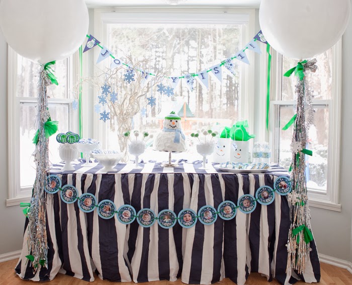 Mom, Julie, took all of the goodness from Johnny’s invitation and created an amazing party!! Some of our favorites from this beautiful tablescape include a banner full of pictures of the birthday boy, sweet treats that match our invitations, and of course–that snowman cake!