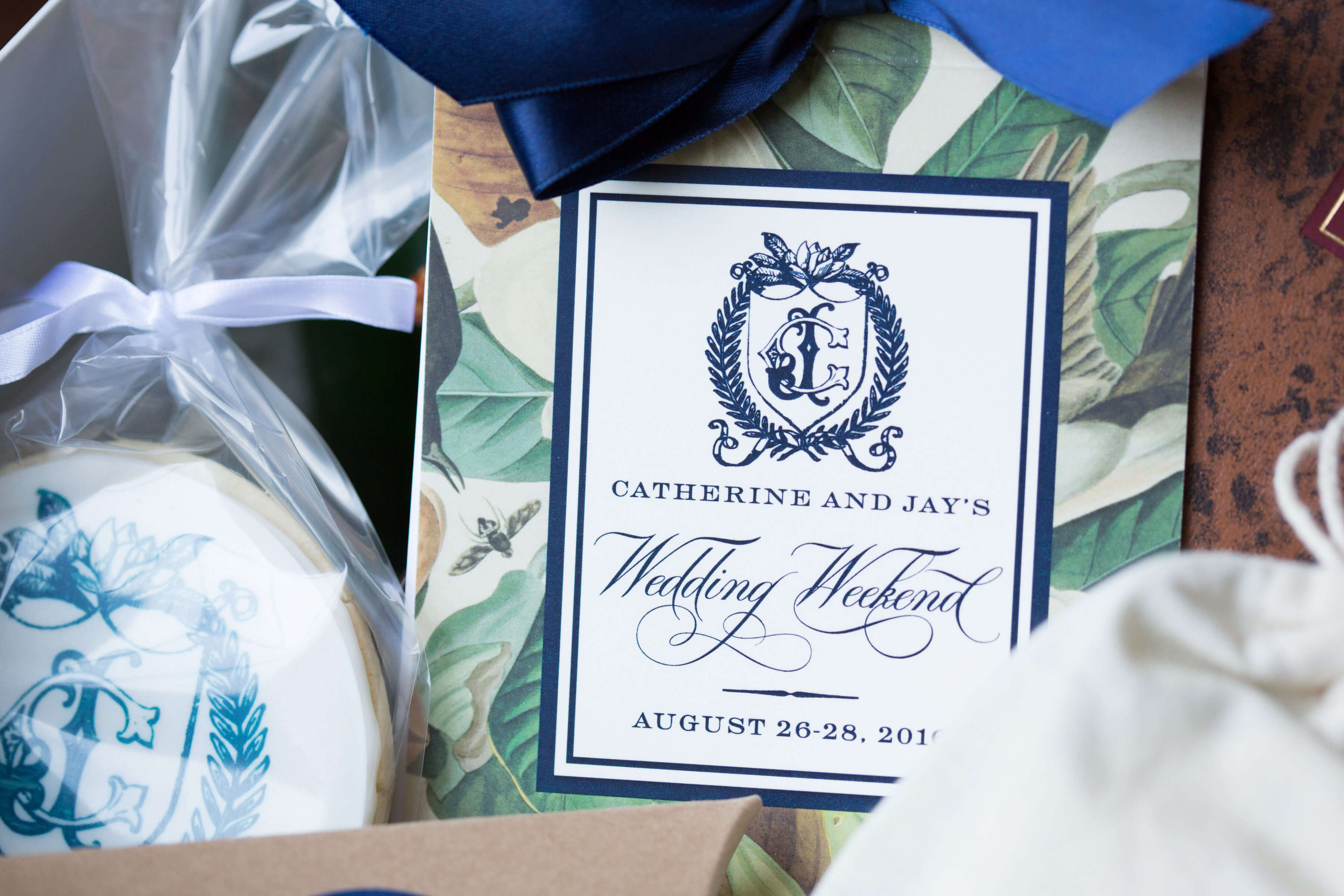 Catherine and Jay’s navy and white southern plantation wedding at Upper Brandon Plantation was everything you dream of a southern wedding to be! It was classic, it was on the groom’s families’ plantation in Virginia, and magnolias and ginger jars were the theme throughout! We have worked with Catherine for years, as we helped brand the store Punch Boutique she now owns in Roanoke, Virginia, and she also throws all her friends every party under the sun! Many a Baby Shower, Bridal Shower, and Bachelorettes have been hosted by Catherine and she has come to us time and time again for all her invitations and swag! So when Jay proposed to Catherine, we could not have been more excited for her! For their southern plantation wedding, we came up with a gorgeous pattern of birds and magnolias, which Catherine knew she wanted throughout the wedding ceremony and reception. The pattern has an old world feel to it, that we thought went well with the tradition and grandeur of their venue; Virginia’s Upper Brandon Plantation which the groom’s father owns! The invitations were letterpressed in a classic navy, topped with an embossed custom wedding logo we designed, and edge painted. All pieces were mailed in a folio bearing the pattern, which was sealed with monogrammed labels. They turned out absolutely stunning! We also blind embossed the wedding programs and tied them with a dark french blue ribbon. Catherine’s bridesmaids were donned in the most gorgeous navy and white striped dresses by Shoshanna and they just make her wedding party photos! We love them so much! Guests danced the night away at this southern plantation wedding and were given their very own magnolia tree as wedding favors with a tag reading, “From Our Home to Yours!” It was everything Catherine and Jay wanted and was a night of celebration with their family and friends!