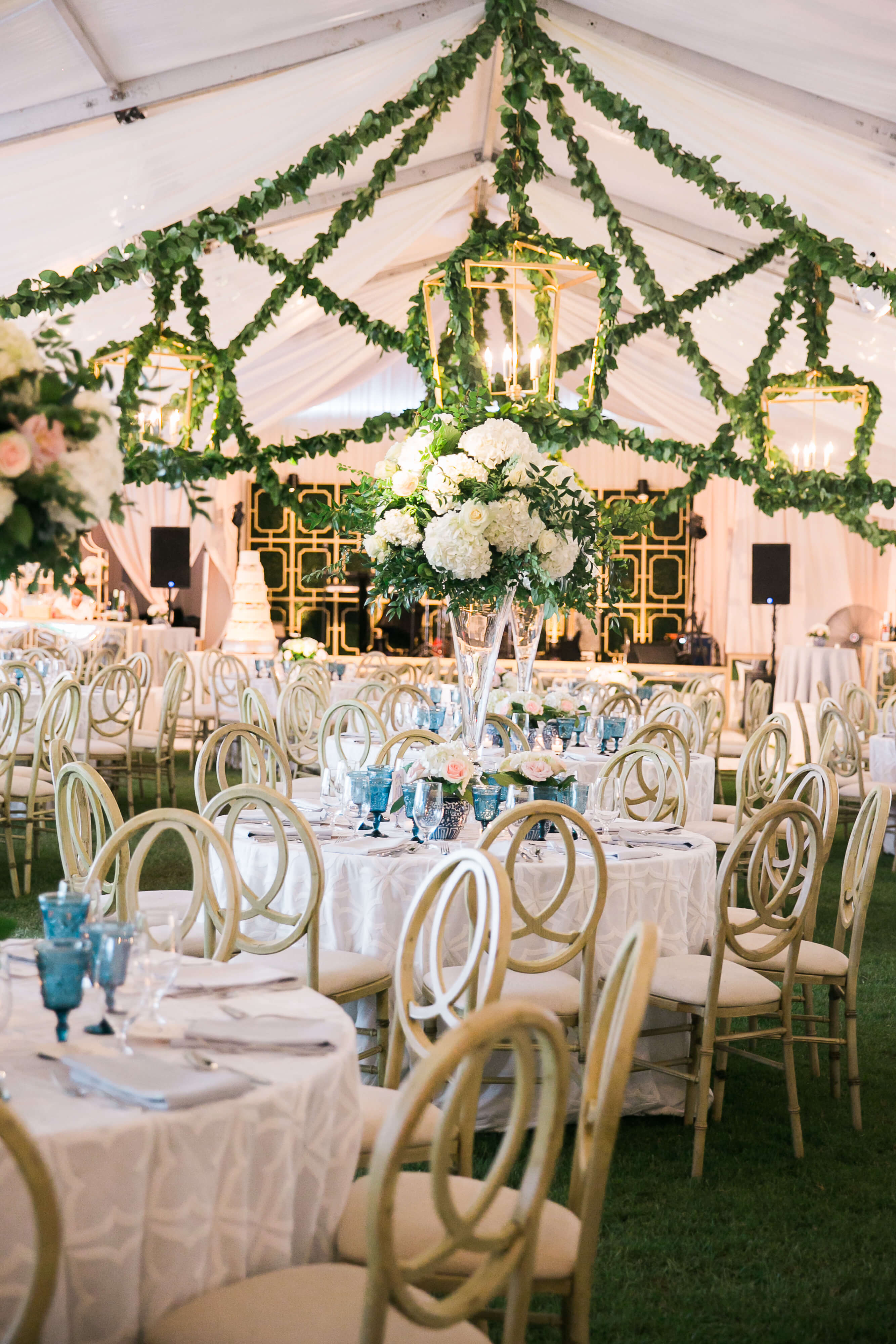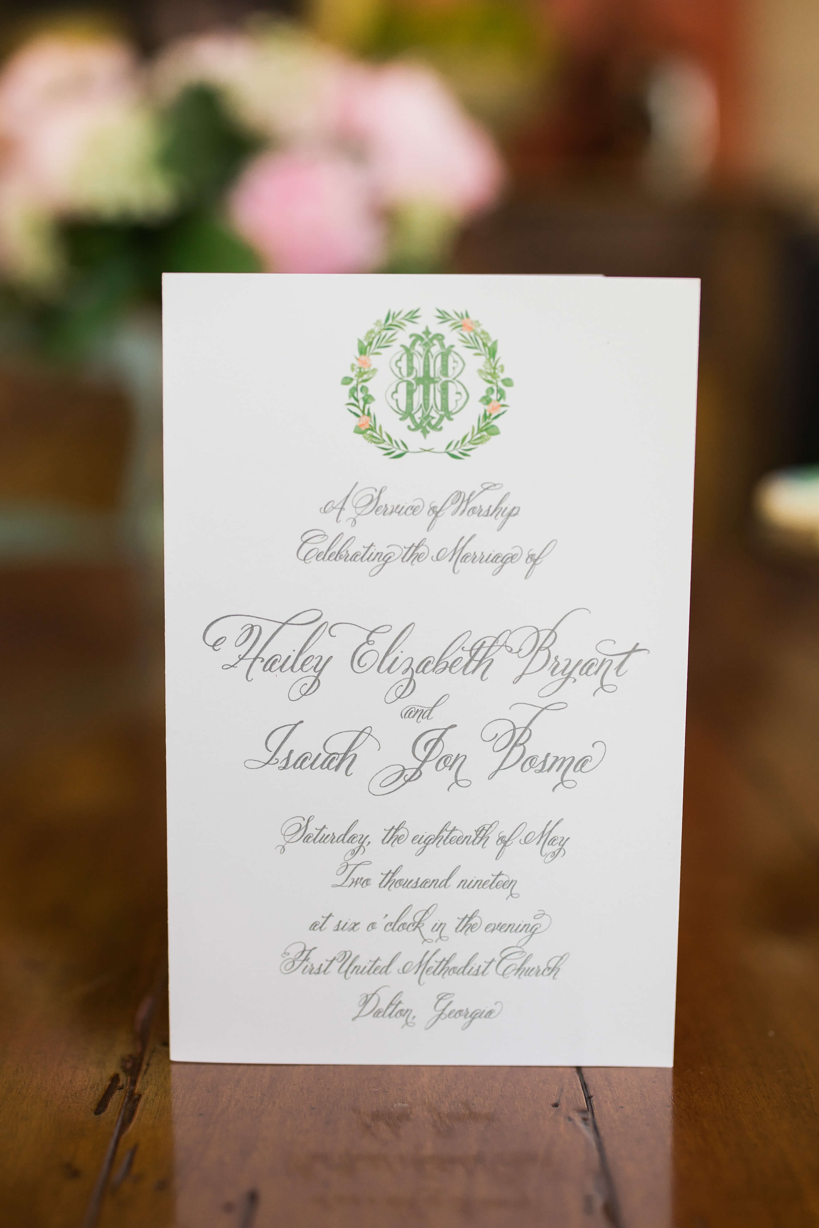 For Hailey and Isaiah’s southern backyard wedding, the vision was lush greenery, splashes of pastels, and a gorgeous hand painted watercolor wedding monogram. The wedding monogram featured the couple’s first initials surrounded by a beautiful crest of flowers and foliage. This set the tone for all the wedding paper goods; what we like to call traditional with a twist! The save the dates were adorned with the wedding logo and the couple’s names and wedding details. For Hailey and Isaiah’s wedding invitations, Hailey and her mother decided upon gray letterpress with a gorgeous leaf green beveled edge. The invitations were done in full script and topped with a vellum overlay showcasing a second version of the wedding logo! Since the reception was to be held in the bride’s parents backyard, a sketch of her childhood home was used on the reception card! We love using personal details such as this to make wedding suites one of a kind! After welcome drinks around the family’s pool, guests entered the tented backyard reception. Lanterns were hung throughout and the ceiling of the tent was absolutely dripping with greenery; it was stunning! Vintage blue glasses were set at each place setting along with a blush colored menu topped with the original watercolor wedding logo. Blue and white ginger jars were also an element sprinkled into the day of paper goods and tablescape! A tiny ginger jar was printed on each tented escort card which sat on table highlighted by a lovely chinoiserie vase filled with florals. This southern backyard wedding was what dreams are made of and we absolutely loved bringing Hailey’s vision to life!